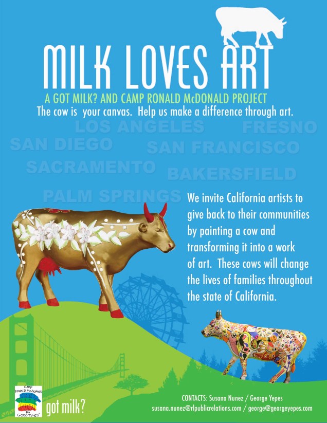We are searching for California Visual Artists to paint 32 life-size cow sculptures as part of a new campaign titled “Milk Loves Art.” Final sculptures will be donated to the Camp Ronald McDonald for Good Times charity. Sculptures will be auctioned off and 100% of proceeds will benefit Camp Ronald McDonald for Good Times.