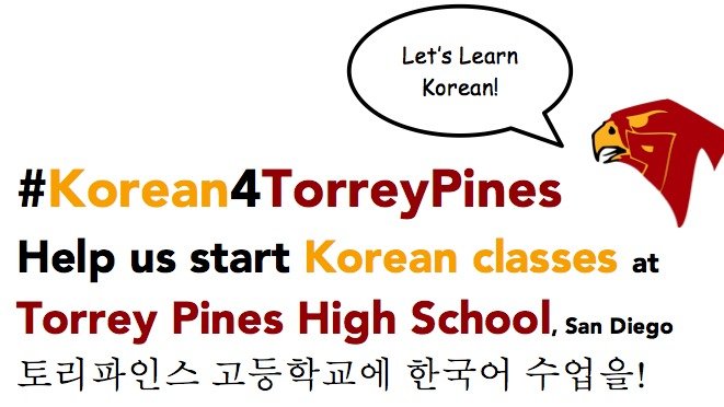 Recently, a group of Korean Americans from San Diego, Orange County, and Los Angeles, are working together in hopes of establishing a Korean language class as one of the world languages offered at Torrey Pines High School in La Jolla. Click Here for the petition link for more information.