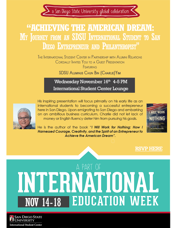 The International Student Center in Partnership with Alumni Relations cordially invites you to a guest presentation featuring SDSU Alumnus Chun Bin (Charley) Yim.
